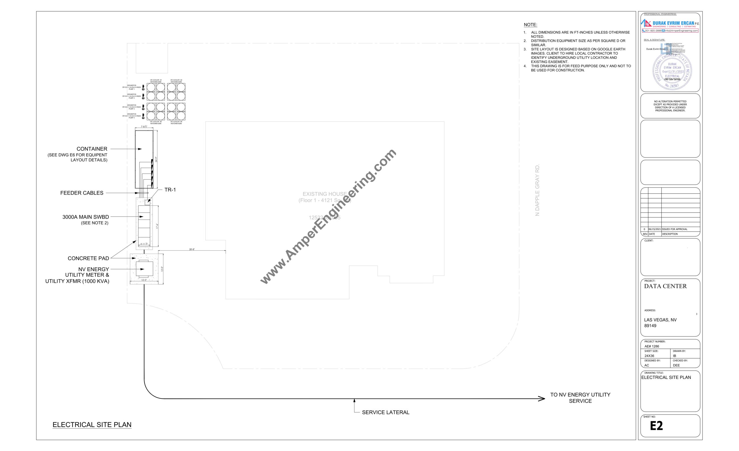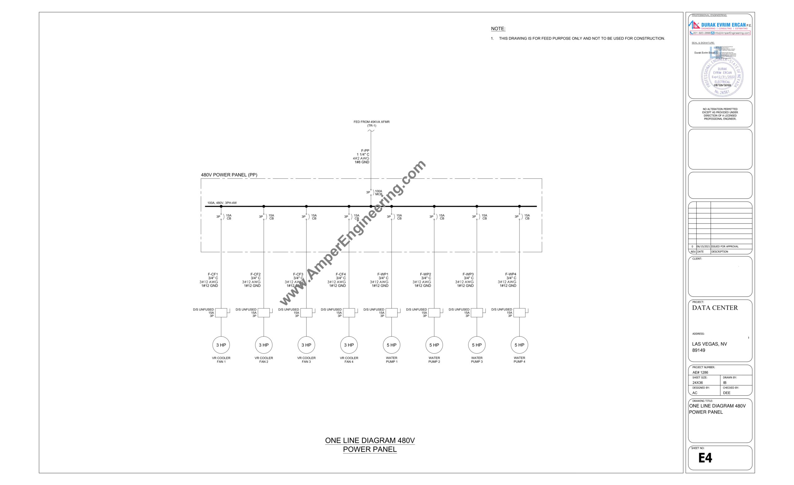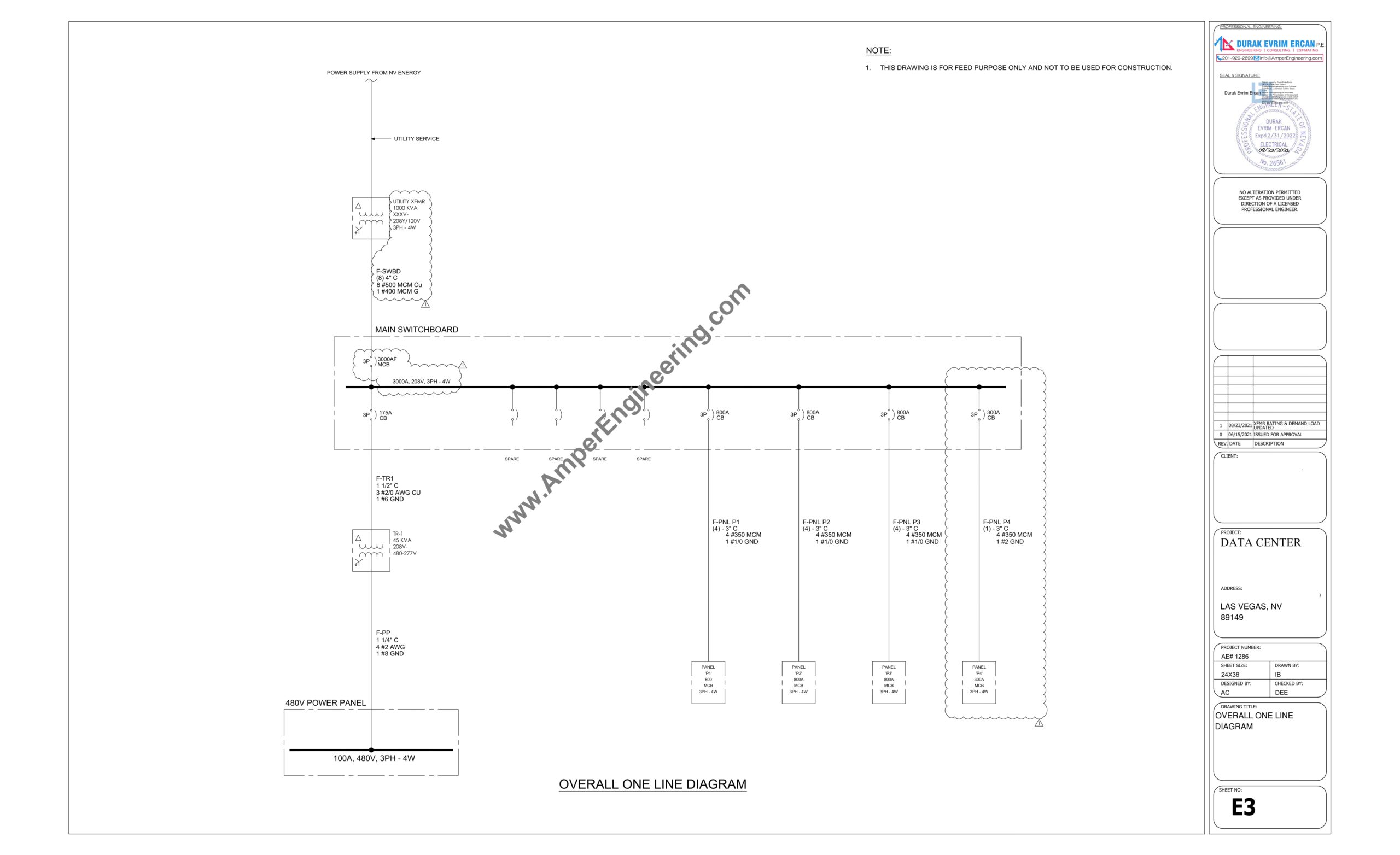 AmperEngineering perform the eletrical design of proposed crypto mining that is to be installed inside a prefabricated container van adjacent to an existing house. AmperEgineering will review the distribution network operators, the necessary electrical demand, power source verification from existing building electrical room or new transformers. The new power source will start from utility service, then fed to new utility meter & transformer rated 375kVA. From utility transformer, voltage will stepdown to 208/120V and fed to new 1200A Main Switchboard installed inside prefabricated container van. From main switchboard it will branch-off to (2) submain feeder going to 480v Panel- PP and Panel P1 (208/120v). After completing the engineering design, AmperEngineering will PE signed & sealed and issued for approval to obtain local AHJ permit.