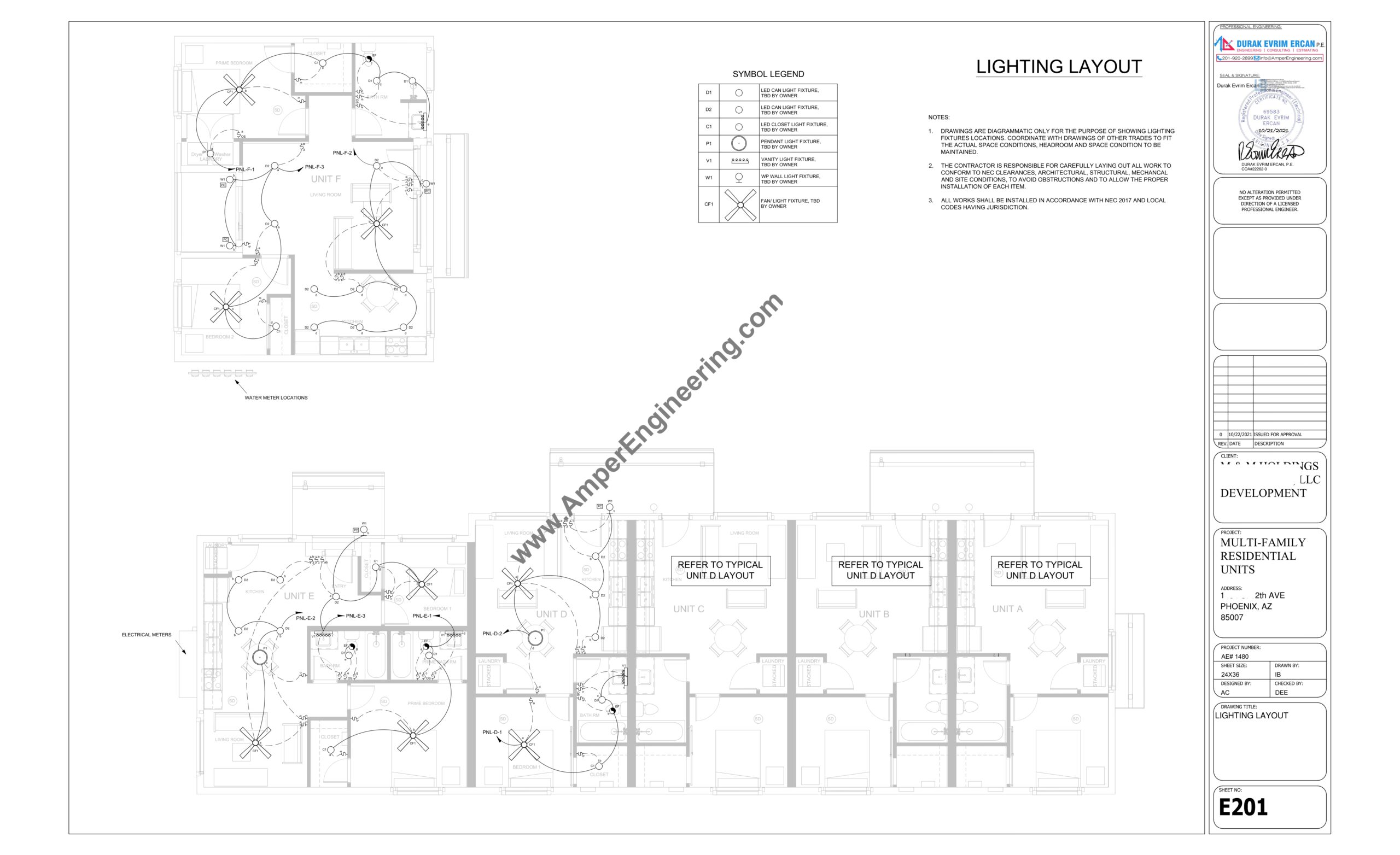 The project type is a residential apartments. An existing (4) unit building to be demolished and build new (6) units residential apartments. Underestimated by many, the residential project is an important step in any work and needs to be developed with attention and care and AmperEngineering make good the electrical design that is correctly dimensioned complying NEC requirements, for the execution of an electrical installation. The electrical design offers a number of benefits, ranging from energy savings to safety. And not least, the peace of mind of knowing you can plug in a piece of equipment without the danger of flashing power or even tripping a circuit breaker. AmperEngineering will PE signed & sealed and issued for approval to obtain local AHJ permit.