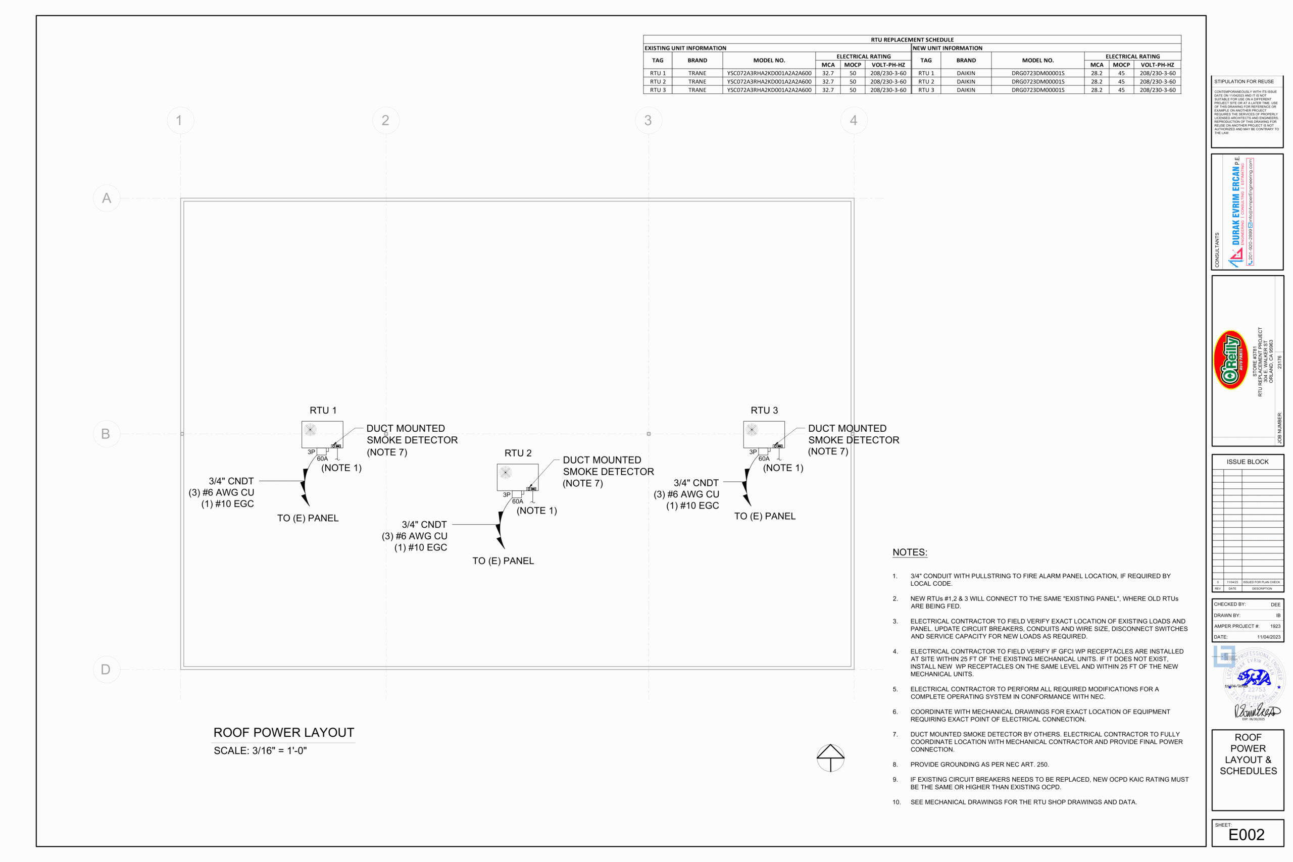 The project is to removed and replaced (3) roof top units with new brand new units in a commercial building. AmperEngineering will perform the electrical design of the RTU electrical requirements. Amper Engineering will review the necessary electrical demand, power source verification from existing building, including analysis of the existing RTU & new RTU load requirements. The electrical design is to provide power connection to the new (3) RTU's as per NEC and local code requirements and review Mechanical & Plumbing design for MEP coordination. Then After completing the engineering design, AmperEngineering will PE signed & sealed and issued for approval to obtain local AHJ permit.