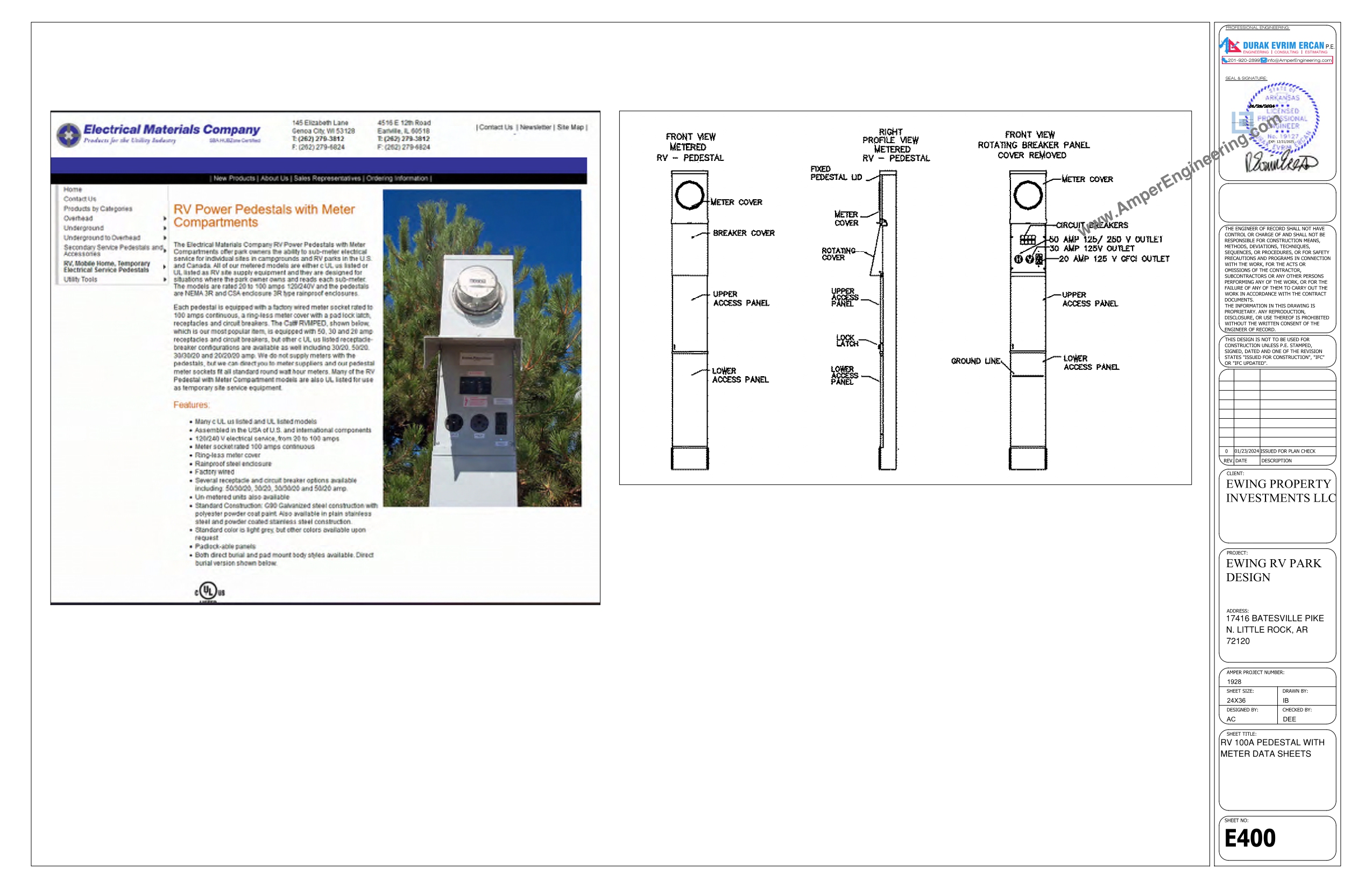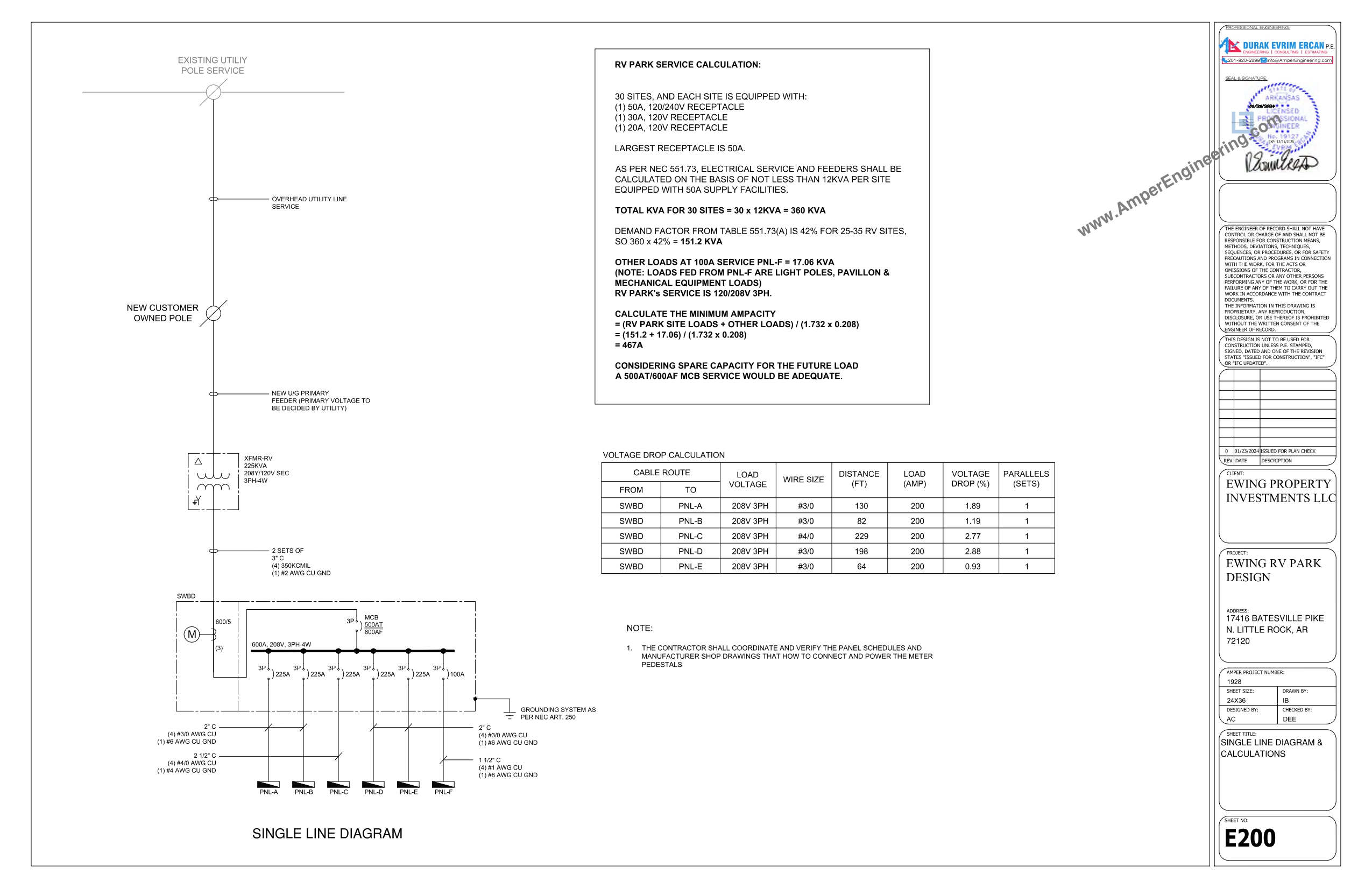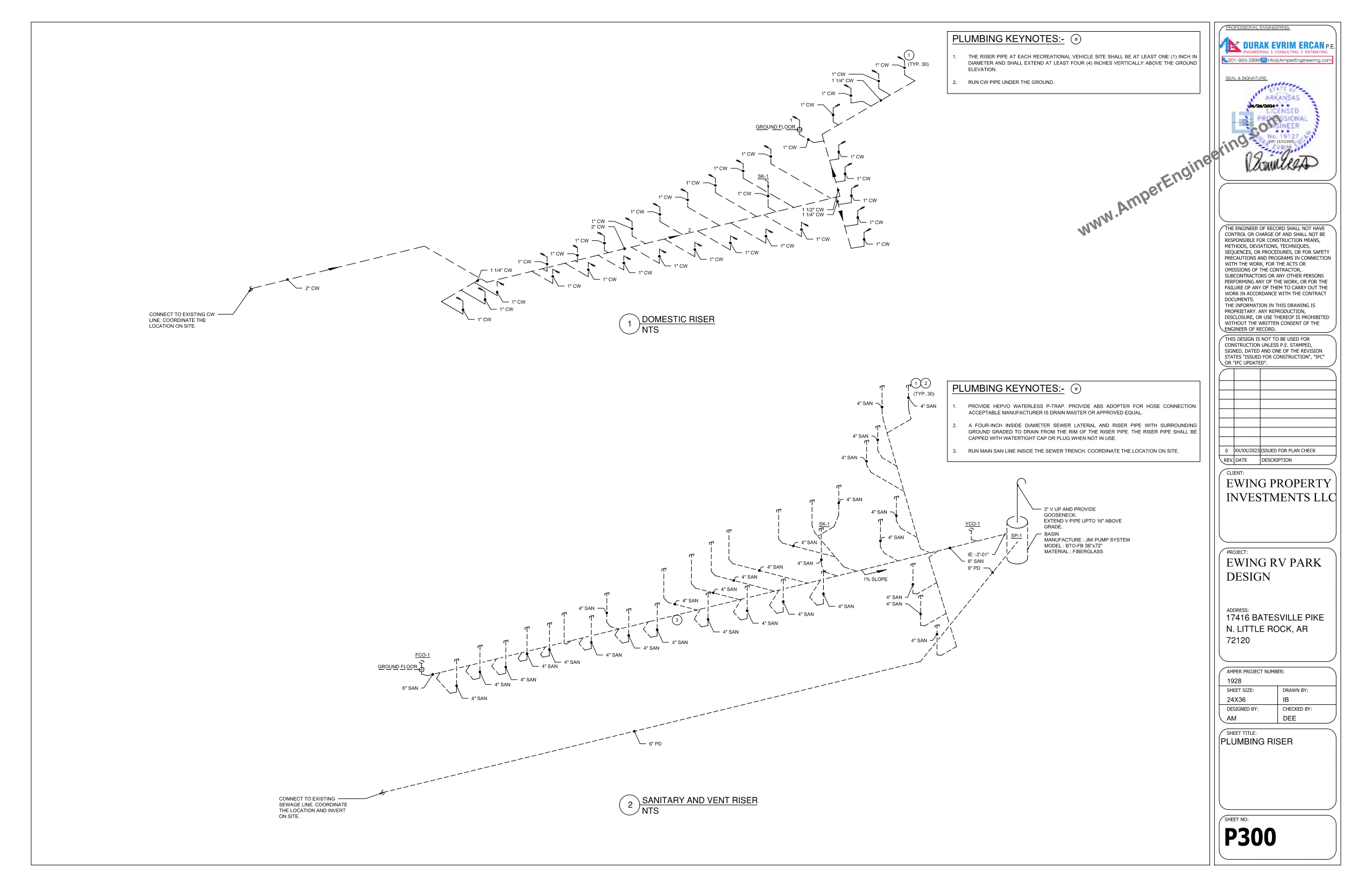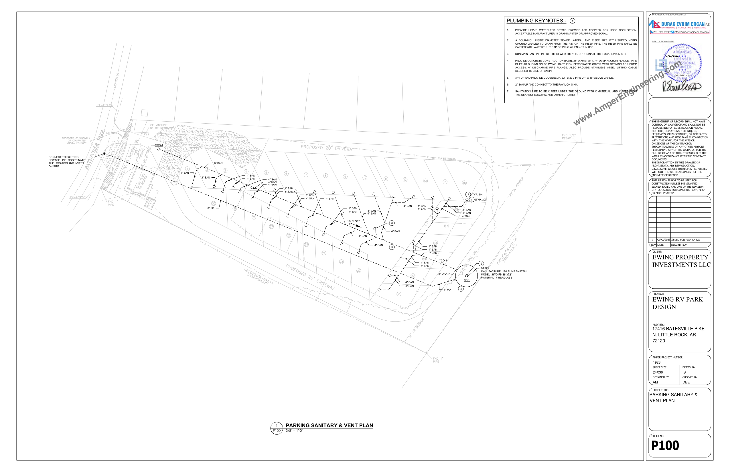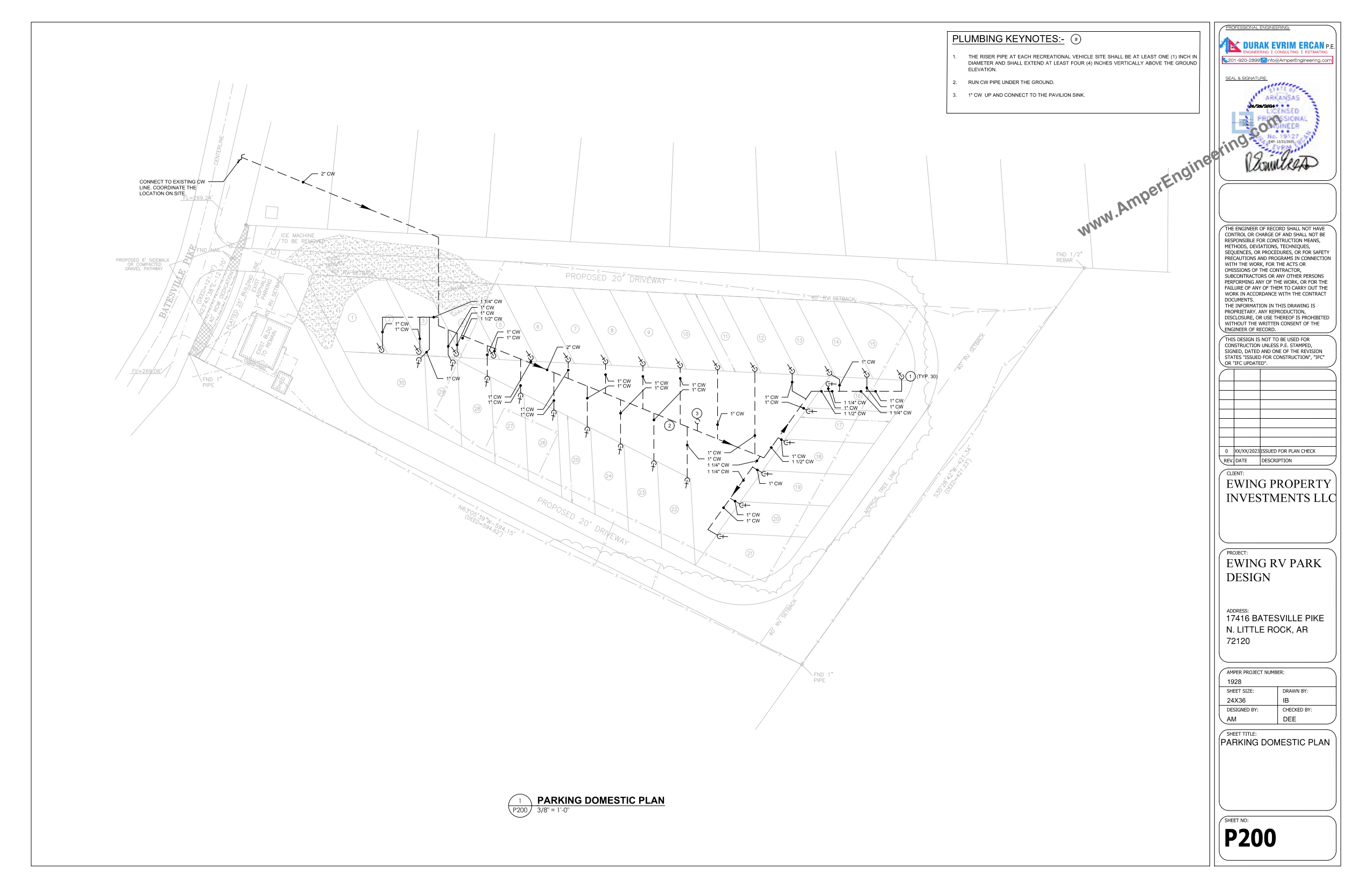 The project type is an RV parking sites. AmperEngineering to provide engineering design (electrical & plumbing) for the installation of (30) RV parking sites located in Batesville Pike, Arkansas. AmperEngineering will provide electric and cold water to each spot and collect sanitation. City sewer line will be above the RV lot, therefore sanitation will be collected (maybe stored with underground storage) and pump up hill to city connection. The new electrical service, therefore switchboard, xfmr-rv, customer owned pole & all its associated wiring and conduits will be fed to the existing overhead utility pole. After completing the engineering design, AmperEngineering will PE signed & sealed and issued for approval to obtain local AHJ permit.